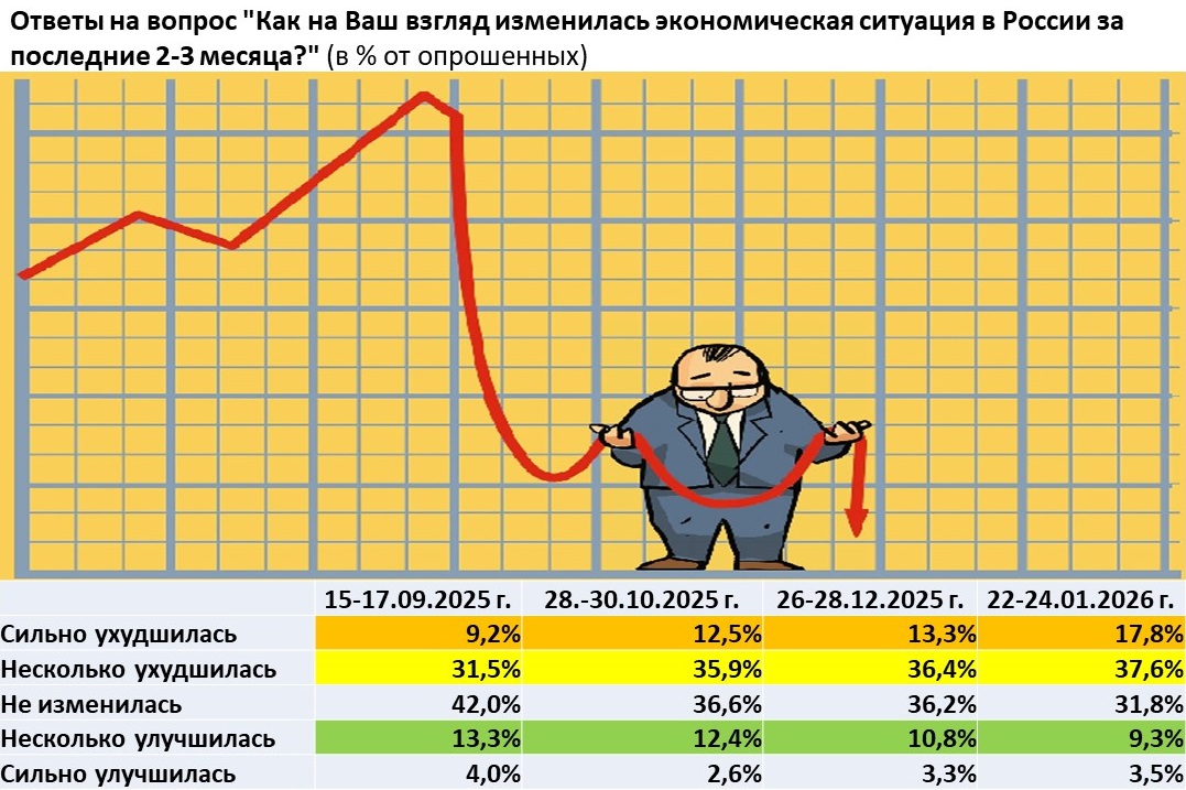 😱 За неполных пять меясяцев наблюдается заметное снижение оценок россиян состояния российской экономики. Если в сентябре 2025 г. серьезные и частичные ухудшения в экономической ситуации отмечали 40,7% респондентов, то уже в конце января 2026 г. таковых стало 55,4%. Плюс 14,7 п.п. - это много за пять месяцев. Доля тех, кто считает, что экономическая ситуация хоть как-то улучшилась снизилась с 17,3% до 12,8%.
