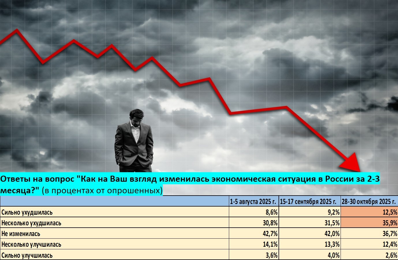 😱 За неполных три месяца наблюдается заметное снижение оценок россиян состояния российской экономики. Если в начале августа серьезные и частичные ухудшения в экономической ситуации отмечали 39,4% респондентов, то уже в конце октября таковых стало 49,4%. Плюс 10 п.п. - это много за три месяца.