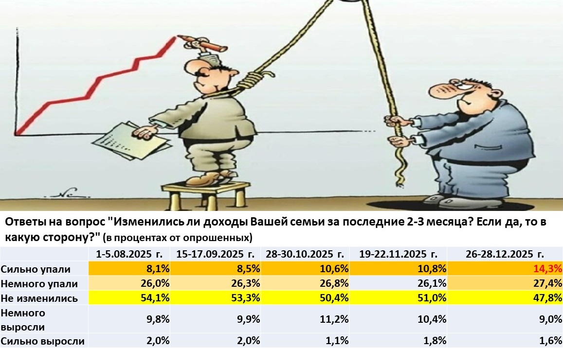 Доля тех респондентов у кого так или иначе доходы выросли с августа по конец декабря 2025 г. снизилась с 11,8% до 10,6%.