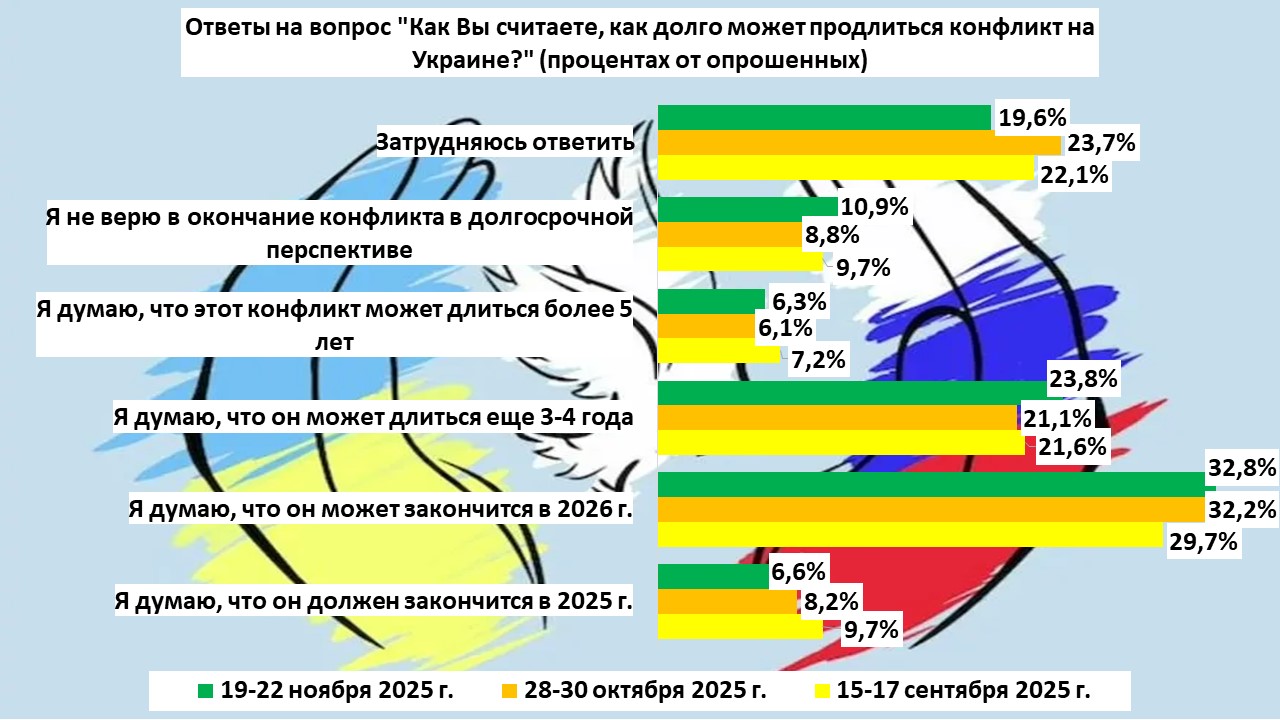 ✅ Платформа "Ваше мнение" спросила россиян об их оценке возможной продолжительности конфликта на Украине. Мы сделали это в сентябре, октябре и ноябре 2025 г. (70 регионов РФ, выборка - 1100 человек).