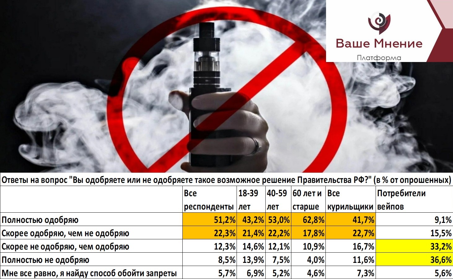 👍Большинство респондентов (73,5%) либо полностью одобряют такое возможное решение Правительства, либо скорее одобряют его. Не одобряют или скорее не одобряют такое решение властей 20,8% респондентов. Больше всего против, конечно, сами потребители электронных сигарет и вейпов (79,8%). Среди возрастных групп населения больше всего против молодежь (28,5%).