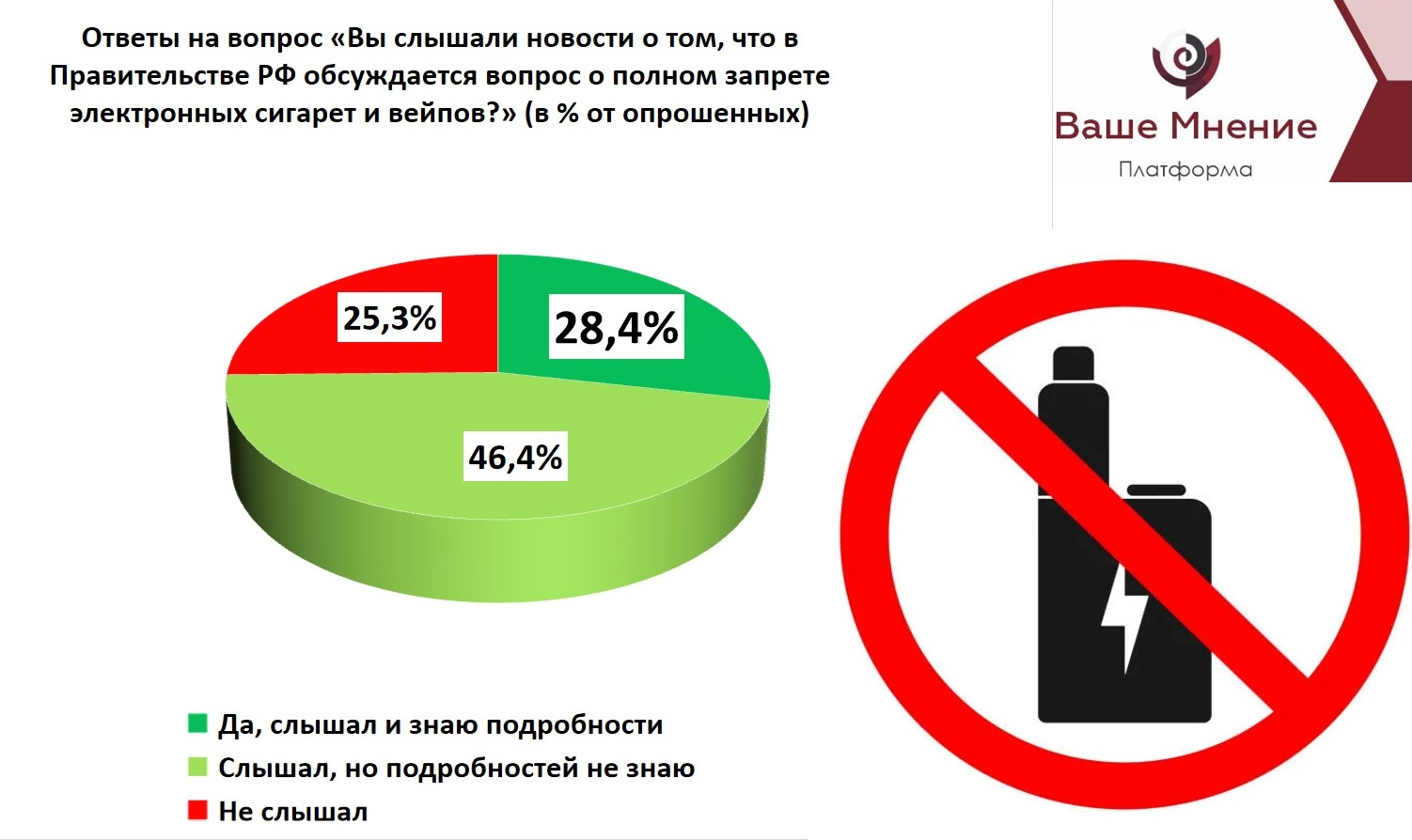 ✅ Платформа "Ваше мнение" спросила россиян знают ли они о том, что в Правительстве РФ обсуждается вопрос о запрете использования электронных сигарет и вейпов и их отношения к данному вопросу (опрос 1-3 апреля 2026 г., выборка 2500 человек, 75 регионов РФ).