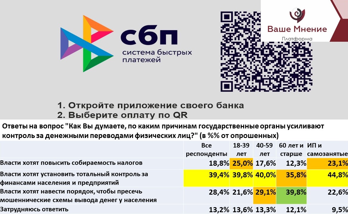 Почти 40% респондентов считают, что государство хочет в приоритетном порядке поставить под тотальный контроль деньги физических и юридических лиц. Только большинство пенсионеров считают, что приоритетом государства в этом направлении является борьба с мошенниками. Особенно обеспокоены возможным тотальным финансовым контролем государства предприниматели и самозанятые (44,8%).