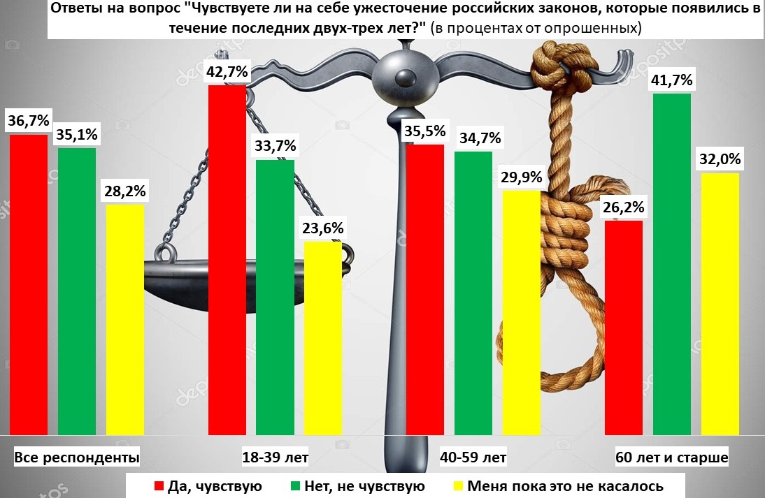👩🎓 Наиболее чувствительной к ужесточению российского законодательства оказалась молодежь - 42,7% молодых людей чувствуют ужесточение законодательства. Менее всего чувствительны к этой теме пенсионеры, среди них таковых оказалось только 26,2%.