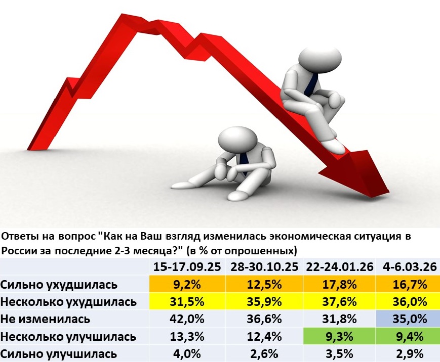 В начале марта 2026 г. зафиксировано некоторое снижение напряженности в оценках россиян. Если в сентябре 2025 г. ухудшения в экономической ситуации отмечали 40,7% респондентов, в конце января 2026 г. таковых стало 55,4%, в начале марта 52,7%. Доля тех, кто считает, что экономическая ситуация хоть как-то улучшилась снизилась с 17,3% в сентябре 2025 г. до 12,3% в начале марта 2026 г.