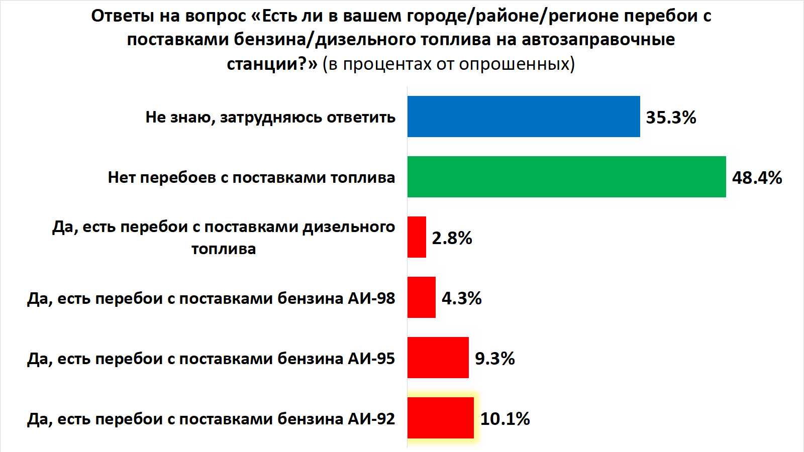 Примерно половина респондентов уверены в том, что никаких перебоев с топливом на АЗС нет, еще 35,3% респондентов не знают ничего про эту ситуацию.