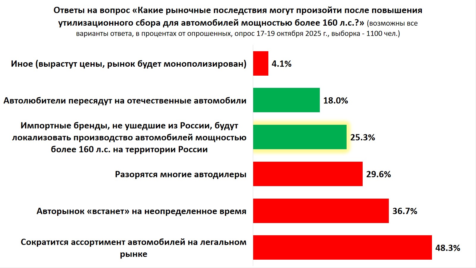 И еще немного данных о возможных последствиях повышения утилизационного сбора для импортных автомобилей мощностью более 160 л.с. Платформа "Ваше мнение" спросила россиян о том, какие могут быть чисто рыночные последствия от введения такого сбора. Они оказались нерадостными - минусов для автолюбителей существенно больше.