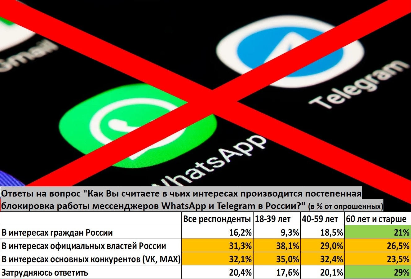 Более 60% респондентов (63,4%) считают, что ограничения в работе мессенджеров WhatsApp и Telegram проводятся либо в интересах государства (31,3%), либо в интересах прямых конкурентов - VK и MAX (32,1%).