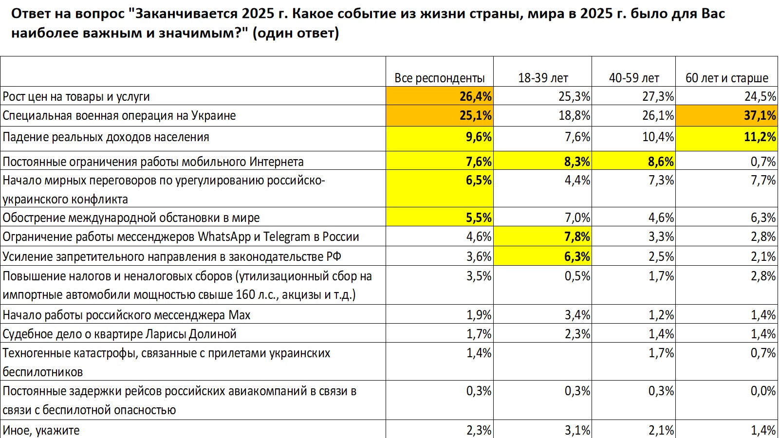 Важнее всего для россиян в 2025 г. были уровень цен и СВО