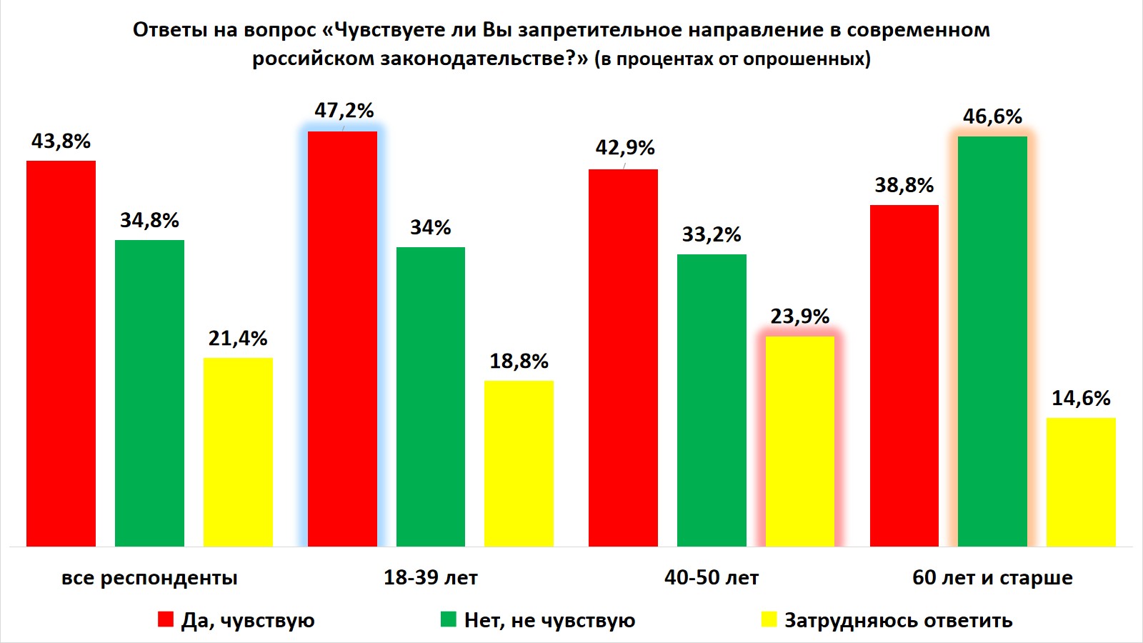 👩🎓 Наиболее чувствительной к запретительным мерам оказалась молодежь - 47,2% молодых людей наиболее остро чувствуют на себе запреты. Менее всего чувствительны к этой теме пенсионеры, среди них таковых оказалось только 38,8%. Отметим, что запреты россияне чувствуют на себе больше, чем ужесточение законодательства. Даже пенсионеры запретительное направление в законодательстве ощущают больше (38,8%), чем просто ужесточение законодательства (26,2%). Слово "запрет" россиянам понятнее, чем слово "ужесточение".